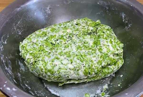 再次放入盆中,放入食鹽,小蘇打,攪拌均勻。再放點等量的小麥面粉,玉米面粉,攪拌均勻,把榆錢攪成團就可以。