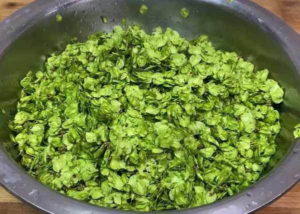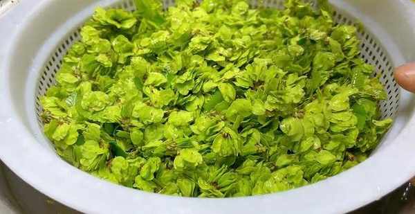 首先把榆錢放入盆中,加入清水,把榆錢多清洗幾遍,洗凈之後撈出,控幹水分。
