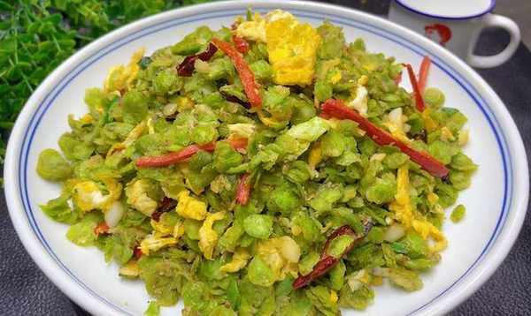 炒鍋中油熱後,把雞蛋液倒進來炒散,炒散之後盛出來備用,炒鍋中加入豬油,油熱後把小料放進來炒香,炒香之後把榆錢放進來,調味加入食用鹽,雞精,胡椒粉,然後開大火快速炒勻,之後把炒好的雞蛋倒進來,翻炒均勻即可出鍋。