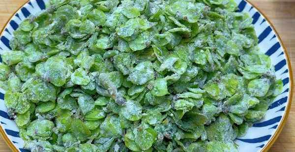接下來,把榆錢中加入食用鹽,小磨香油,攪拌均勻後再加入一勺面粉繼續攪拌均勻。然後平鋪在蒸屜中,上汽後蒸五分鐘左右。蒸好後盛出來備用。