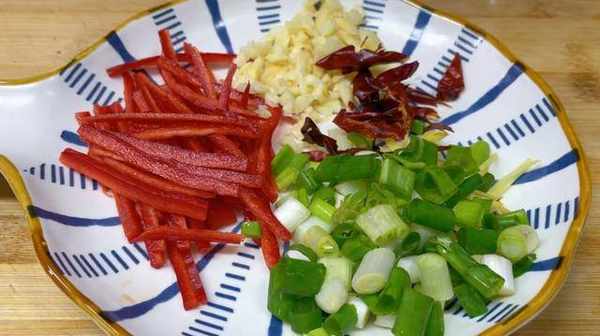 接下來,小碗中打入兩個雞蛋打散。少許紅椒切成細絲,小蔥切成蔥花,生薑切成細絲。一把大蒜剁成蒜蓉。再準備兩個幹辣椒絲。