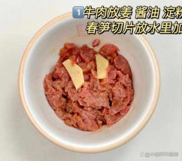 第一步:選購好新鮮春筍,口蘑和牛肉裡脊,先把牛肉裡脊切掉多餘部位,牛肉裡脊記得要切薄一些,牛肉要逆著紋路切,牛肉片不能直接下鍋炒,牛肉片放在容器裡調味醃制,加上一些薑片,加上食鹽,醬油和蠔油,加上玉米淀粉半勺,滴入一些橄欖油,快速鎖住營養,抓拌至均勻,醃制入味。
