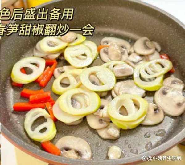第五步:鍋中繼續加上橄欖油,加上一些蒜末和薑末,倒入一些紅椒絲,倒入口蘑和春筍,快速煸炒至斷生。