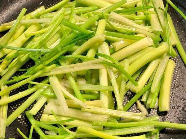 3、蒜剝膜切片或拍碎。辣椒洗凈剪斜片。鍋中小火放1小匙油先煸蒜末。蒜煸出香味,先放鹽巴再放芹菜梗,放到鍋中翻炒一下,蓋鍋悶炒2分鐘,芹菜先夾出,蒜末放鍋中。