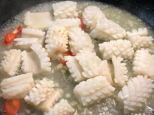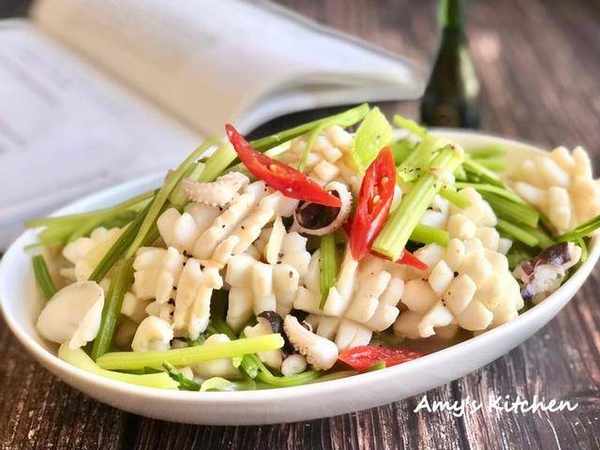 食材:冷凍花枝塊500克、芹菜200克、蒜瓣4瓣、辣椒1/3根、油2小匙、米酒3大匙