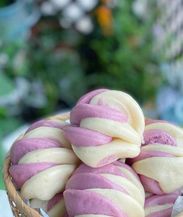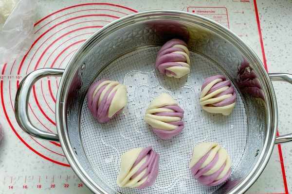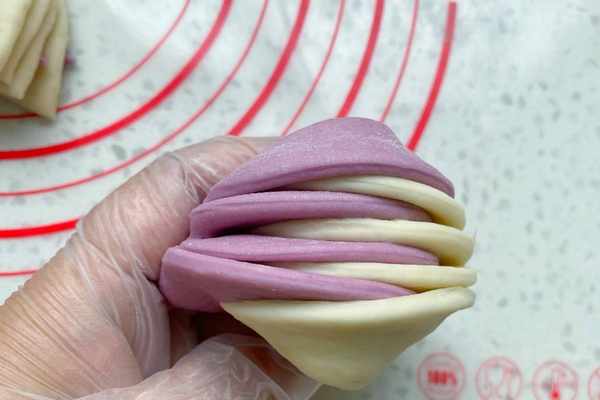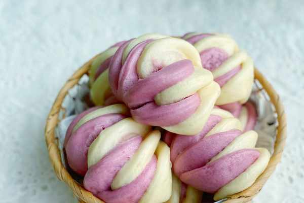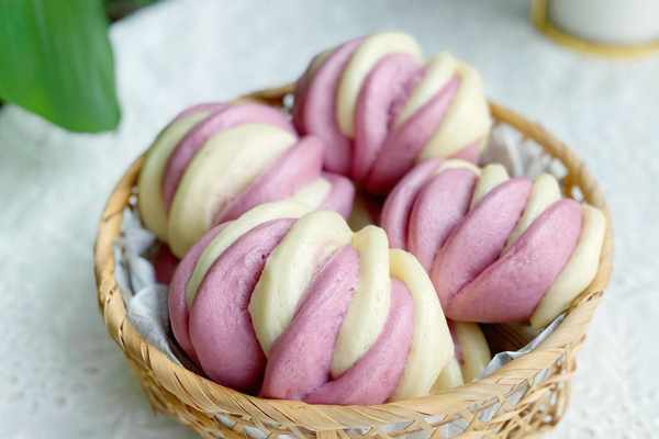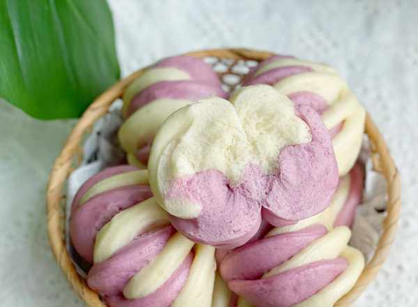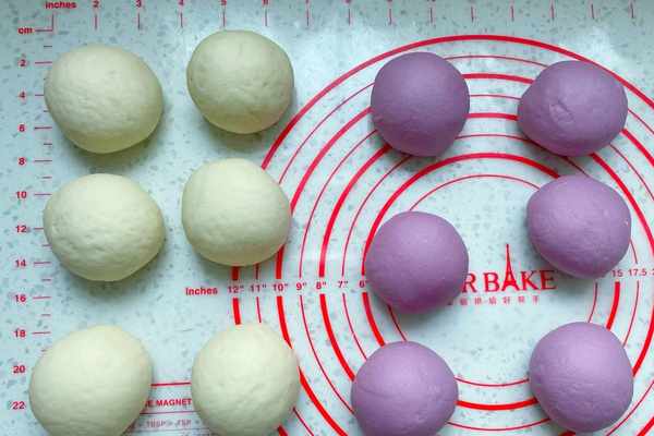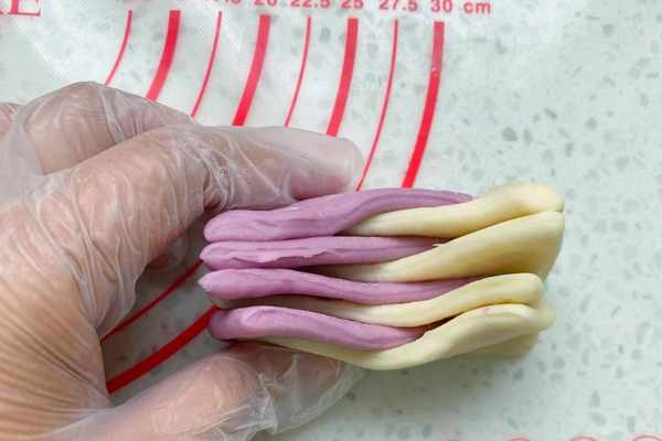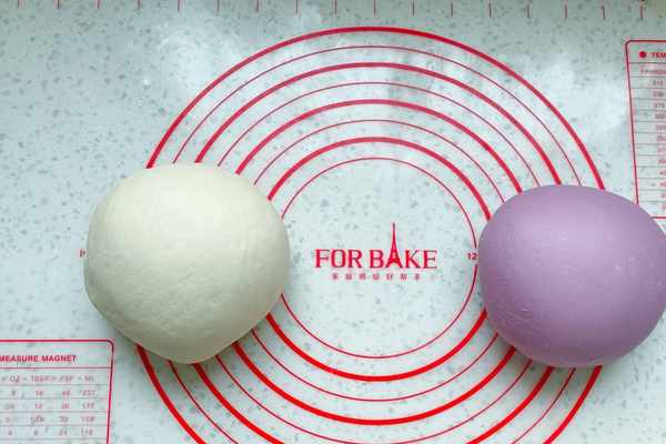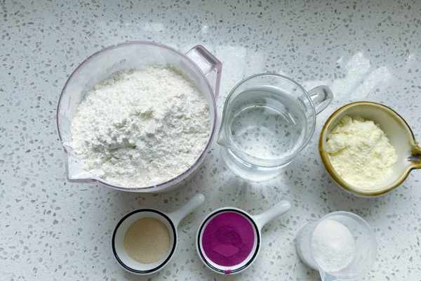 紫色面團:中筋面粉280克,紫薯粉20克,奶粉15克,細砂糖10克,清水155克,酵母3克