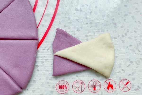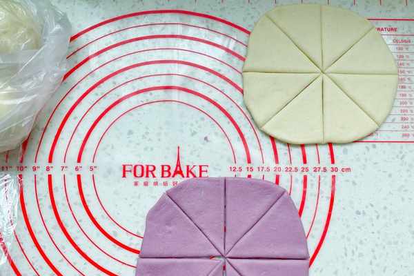 6、分別取一個白色和紫色面團,用搟面杖搟成直徑約12厘米左右的面片,把面片用刀切八片,也就是切個米字型。