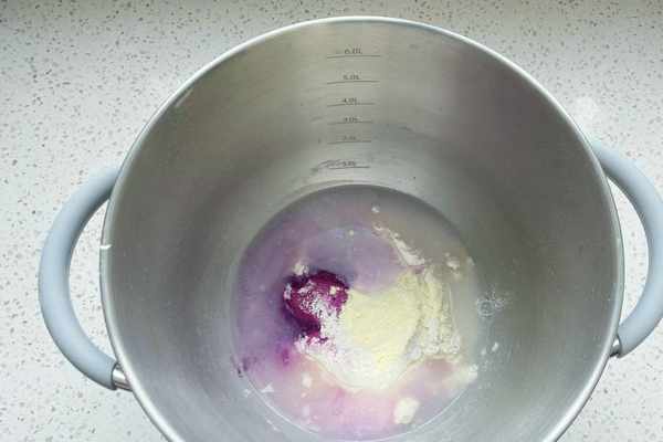 3、同樣的方法,把紫色面團用到的食材,放入廚師機桶裡,揉至光滑。