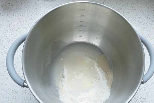2、先制作白色的面團,把白色面團所用的食材,放入廚師機桶裡,用廚師機揉面5分鐘揉至光滑即可。