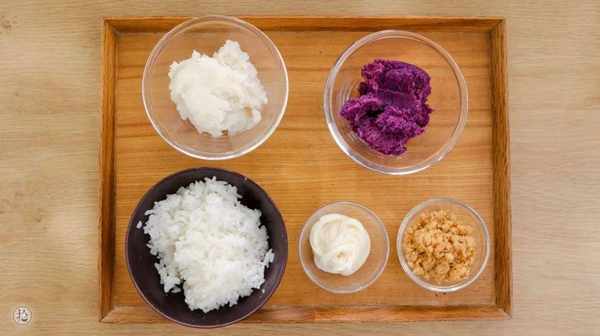 1.米飯與蒸好的紫薯混合均勻,蒸熟的山藥泥加沙拉醬混合攪拌均勻。