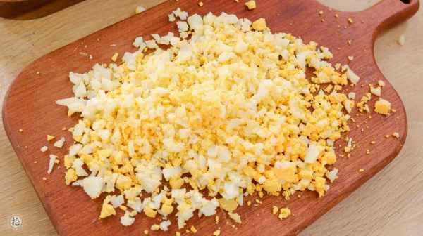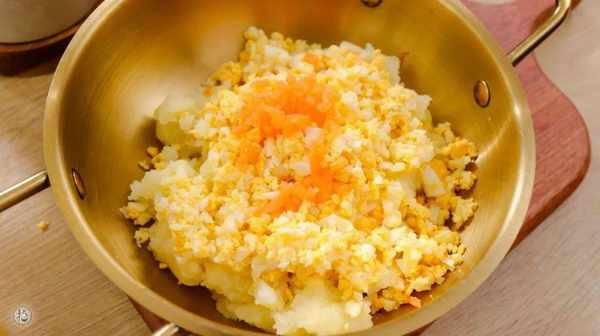 2.土豆泥中擠入沙拉醬,加入雞蛋碎、胡蘿卜碎,混合攪拌均勻。