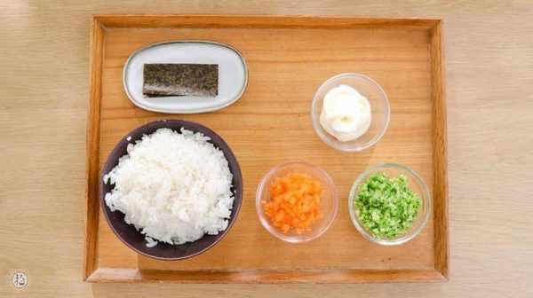 食材: 米飯/一碗、西藍花、胡蘿卜/適量(提前焯水)、沙拉醬、海苔片/適量