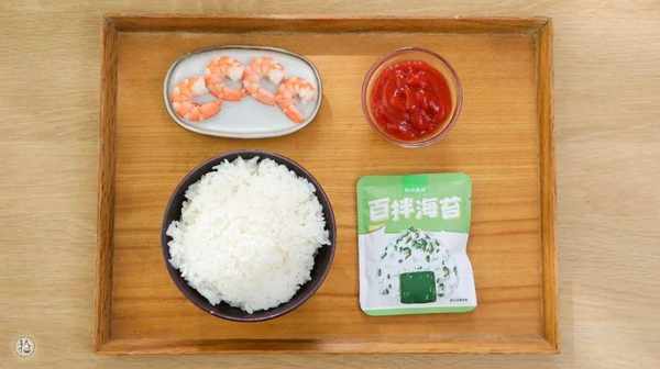 食材: 米飯/一碗、番茄醬/適量、拌飯海苔/適量、蝦仁/適量(提起焯水煮熟)