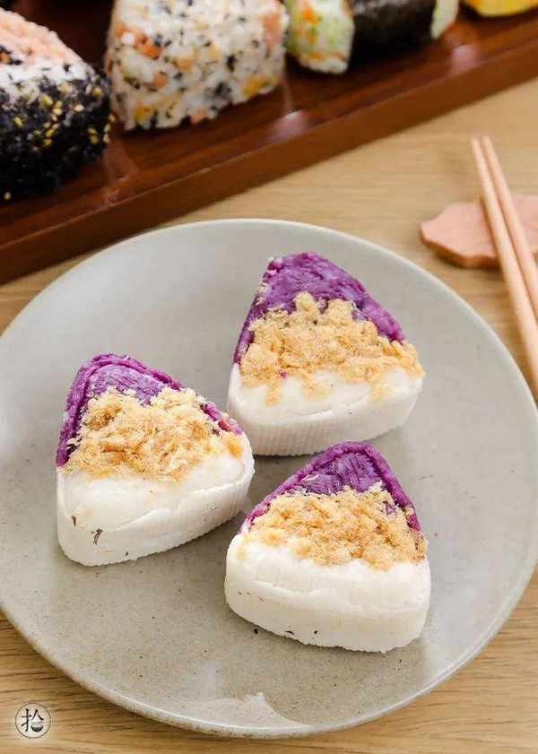 食材: 米飯/半碗、紫薯、山藥/適量(提前蒸熟)、沙拉醬、肉松/適量