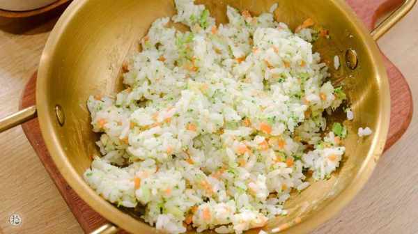 1.把焯水後的雜蔬丁放入米飯中,擠入沙拉醬,混合攪拌均勻。