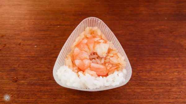 2.飯團模具放入三分之二的番茄米飯,剩下的放入白色米飯,中間放入蝦仁,整理好形狀,壓成飯團。