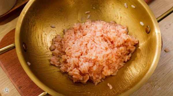 1.取一部分米飯,加入番茄醬,抓捏均勻上色。