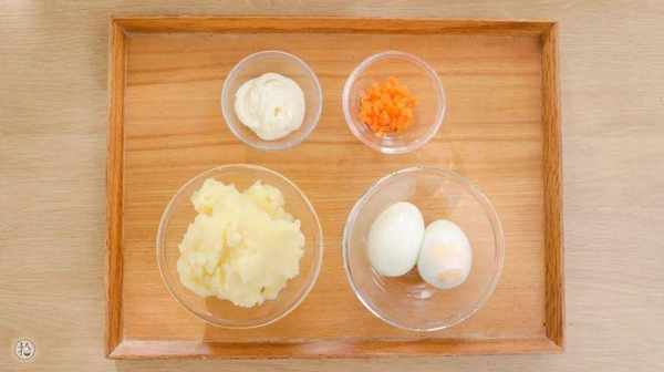 食材:土豆/1個(提前蒸熟壓成泥)、雞蛋/2個(提前煮熟)、胡蘿卜/適量(提前焯水)、沙拉醬/適量