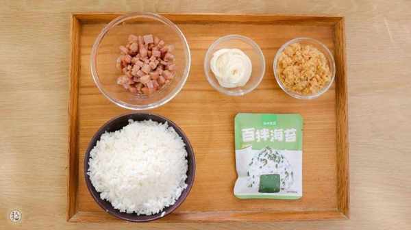 食材: 米飯/一碗、午餐肉/適量(提前切丁煎熟)、拌飯海苔/適量、肉松/適量、沙拉醬/適量