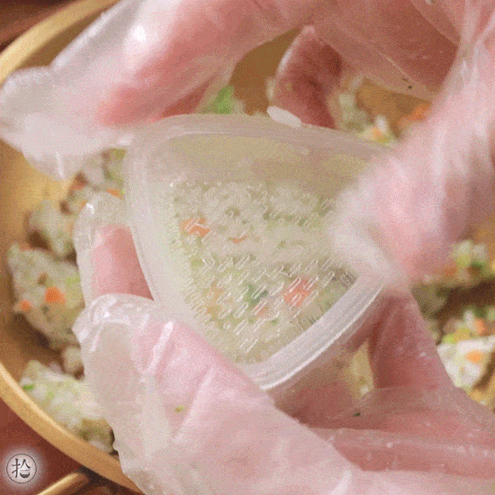 2.放入三角飯團模具,壓成飯團就可以瞭。