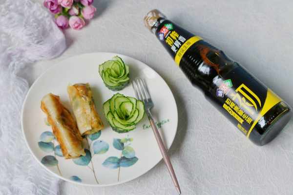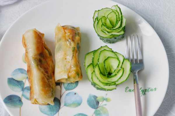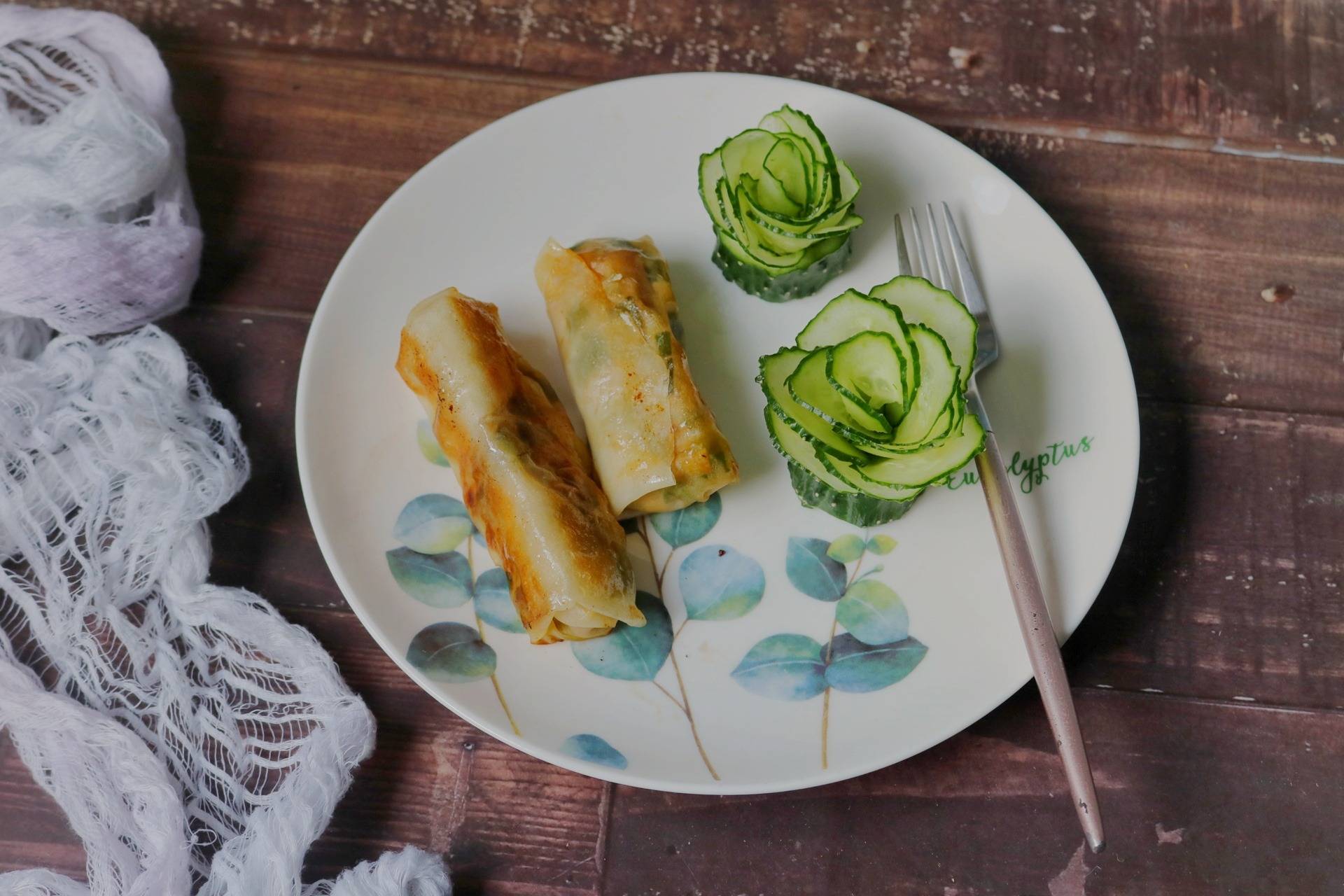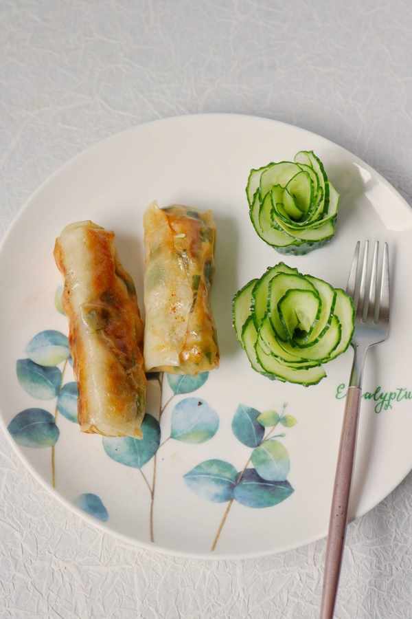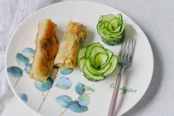 10、切一些黃瓜薄片,擺兩朵黃瓜花,再放上香脆的春卷,美美的,和這個季節最為相配。
