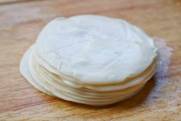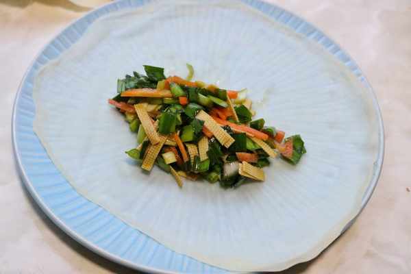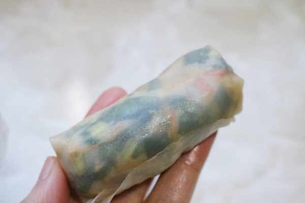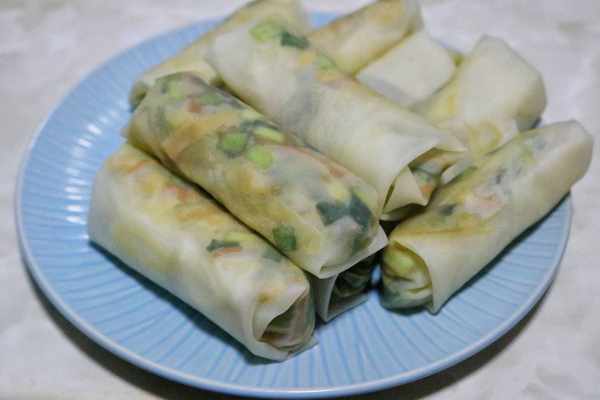 7、把餃子皮包成春卷,隱隱透出餡料的顏色,很好看。