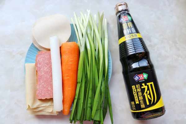 材料:餃子皮20個,韭菜100克,胡蘿卜1小跟,豆腐皮半張,火腿20克,蔥5克,欣和初榨原釀生抽15克,芝麻油適量。