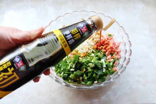 3、把切好的食材丁都放入碗裡,加入適量生抽和芝麻油拌勻,春卷餡就做好瞭。