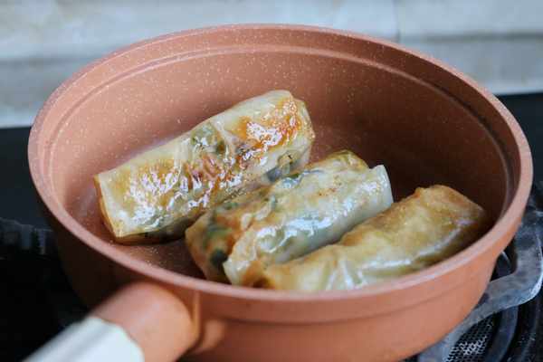 9、鍋裡放油,放入春卷煎至表面焦黃酥脆,盛出來待用。