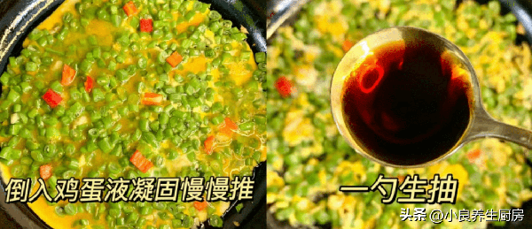 第五步:倒入四季豆炒至斷生,淋入調好的雞蛋液,將雞蛋液均勻鋪開,丟入一些小米辣,用中小火慢慢煎至凝固,用鍋鏟慢慢推幾下。