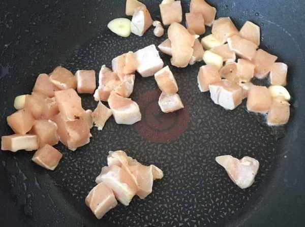 2、起鍋燒水,加入一勺鹽、一勺油,倒入西藍花、胡蘿卜煮2分鐘,斷生後撈出過涼水,瀝幹水分。薑蒜切末,起鍋燒油,放入薑蒜末爆香,倒入雞身材肉翻炒至變色,盛出備用。