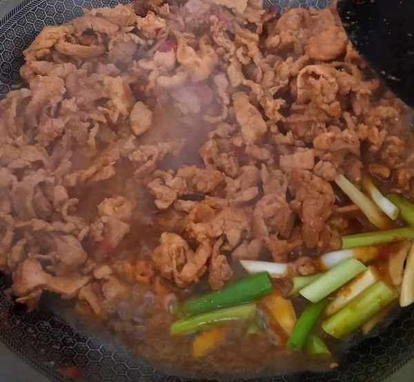 2、蒜瓣去皮後切末,生薑切片,萵筍擠幹水分備用。起鍋燒油,四成熱時倒入醃好的肉片,中火滑炒至變色後盛出。