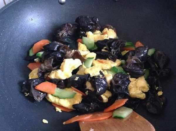 2、起鍋燒油,六成熱時倒入雞蛋液,大火煎熟後炒成大塊,盛出備用。鍋裡留底油,放入黑木耳翻炒一會兒,再倒入胡蘿卜炒一會兒,炒至斷生。倒入黃瓜片、雞蛋塊,加入適量食鹽調味,翻炒均勻後即可出鍋。