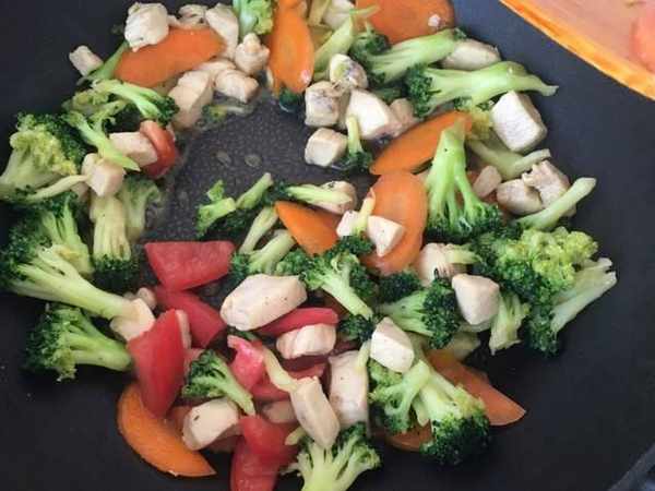 3、鍋裡留底油,放入西紅柿塊炒出紅汁,再倒入西藍花、胡蘿卜,大火翻炒2分鐘,最後放入炒好的雞身材肉,加適量食鹽、生抽、蠔油調味,翻炒均勻即可出鍋。