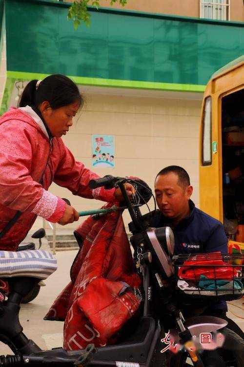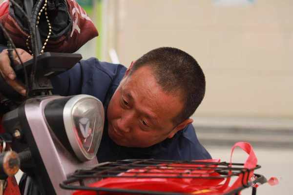 2023年4月14日,河北衡水,修車師傅和妻子配合為顧客換電動車閘線。(王亞楠攝/光明圖片)