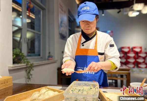 在山東煙臺一傢水餃店,廚師在包鮁魚水餃。 中新社記者 王嬌妮 攝