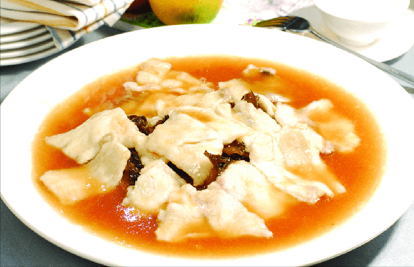 接著將糟酒、白糖、鹽、味精和雞精等放入開水中調味,再放入魚片,用淀粉水勾芡後煮熟即可。