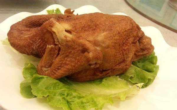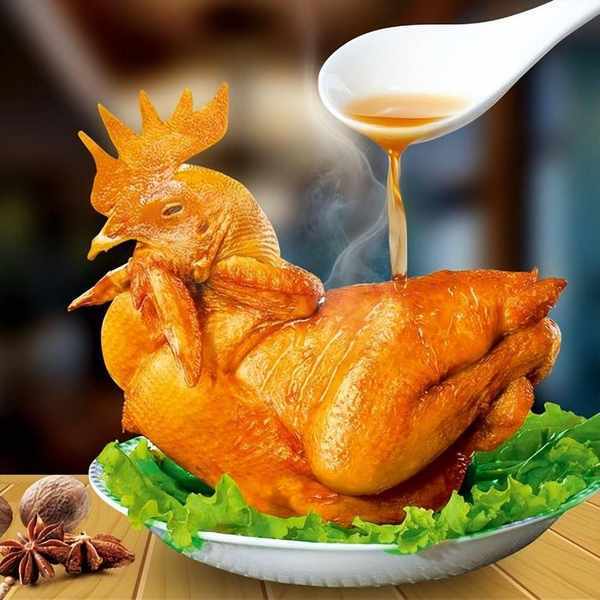 制作時先將糖水抹在清洗幹凈的雞的外表上,然後將雞炸至金黃,瀝幹後再與清水、五香料包、生薑、鹽、醬油等調料共同燜煮至熟即可。