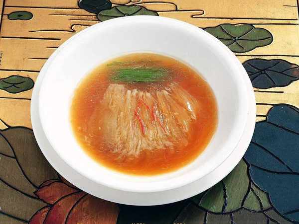 制作好的三絲魚翅色彩豐富,魚翅金黃透亮,三絲黑、白、綠三色相間。不僅顏色多樣口感也十分豐富,魚翅新鮮軟爛,汁濃味香。