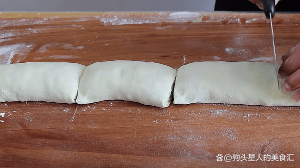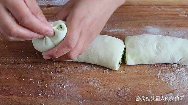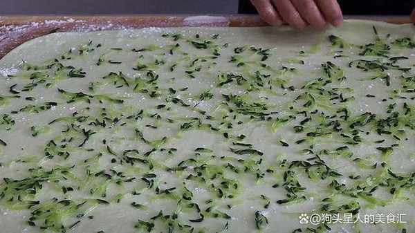6.案板上撒點幹粉,把面團移過來,稍稍按扁,把它搟成長方形面片。先在表面塗抹上一層食用油,再撒點幹粉,然後把黃瓜撒上去。