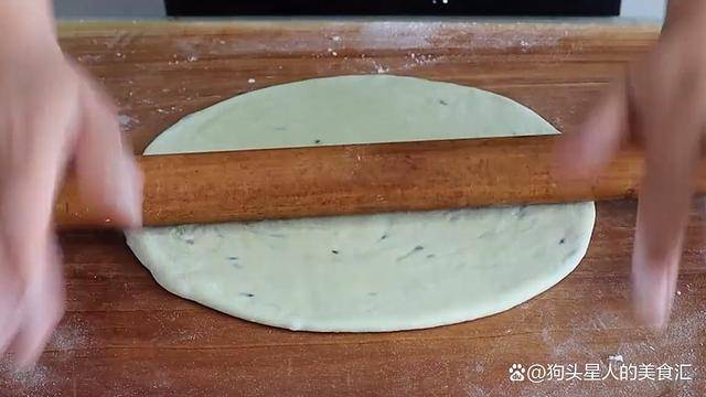 10.取第一個做好的生坯,按扁,再用搟面杖搟成圓形面片。厚度在0.2-0.3厘米左右。