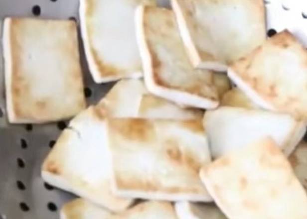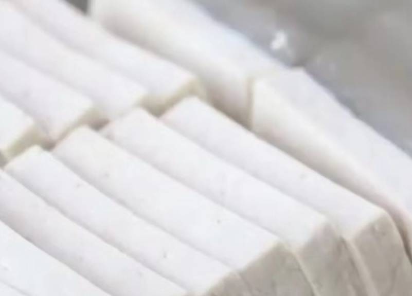 2、炒鍋上火,留適量底油,小火下入改刀後的豆腐煎制,至兩面金黃時盛出待用;