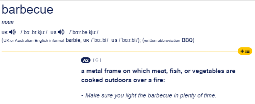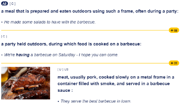 劍橋詞典對 barbecue的定義是 a meal prepared using such a frame and usually eaten outside,也就是在戶外烤架上烹制的食物。
