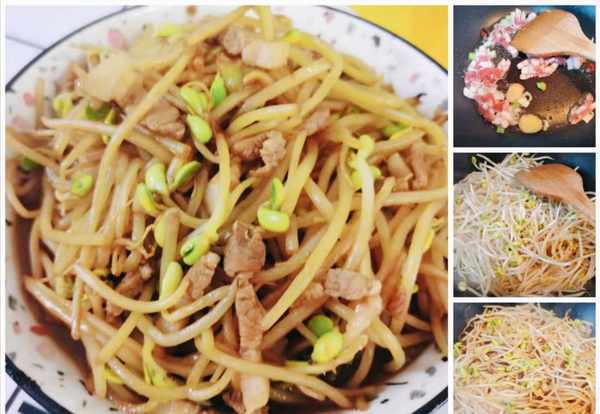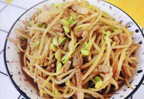 1、五花肉切成細條、黃豆芽摘洗幹凈備用