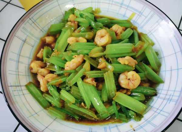 3、放入芹菜翻炒幾下,再倒入蝦仁