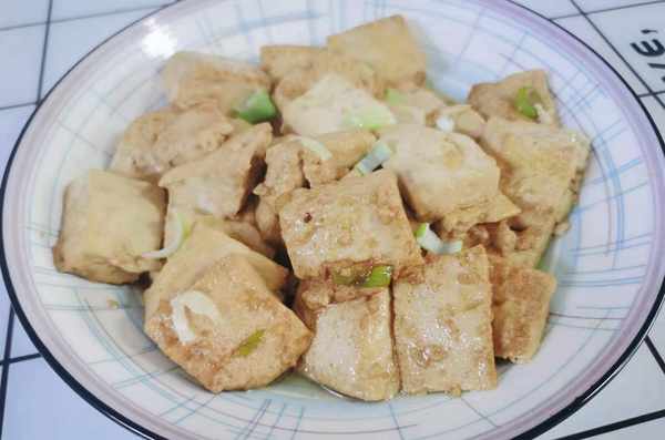3、倒入豆腐,加入一勺生抽、半勺老抽、適量的鹽,少許清水,翻炒幾下,然後蓋上蓋子燜一兩分鐘即可