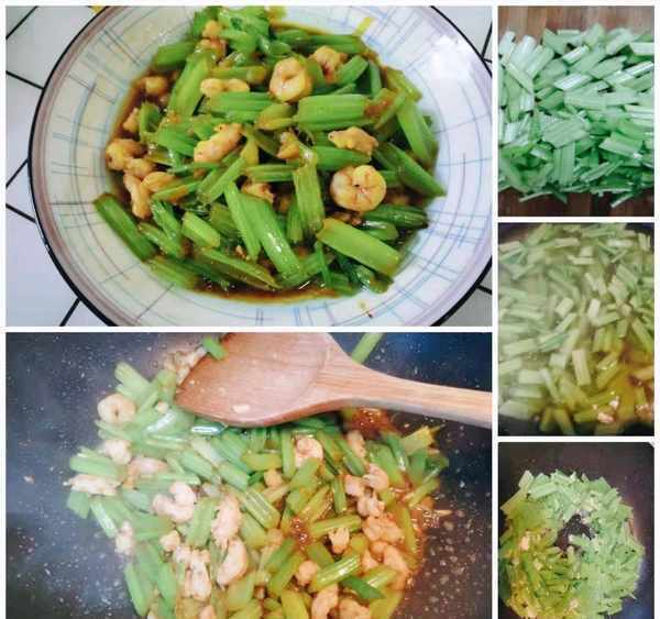 1、芹菜切段兒,芹菜、蝦仁焯水備用