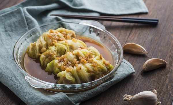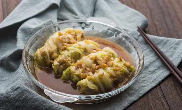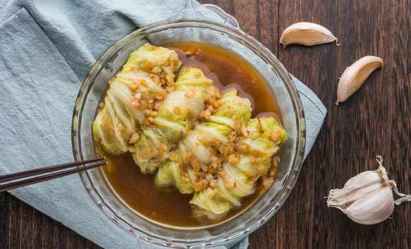 包好的白菜卷上鍋蒸20分鐘左右。時間到瞭之後另起鍋燒油,放入蔥蒜末爆香。放入兩勺蒸魚豉油調味,倒入準備好的開水,然後使用水淀粉勾芡,淋在白菜卷上即可開吃。