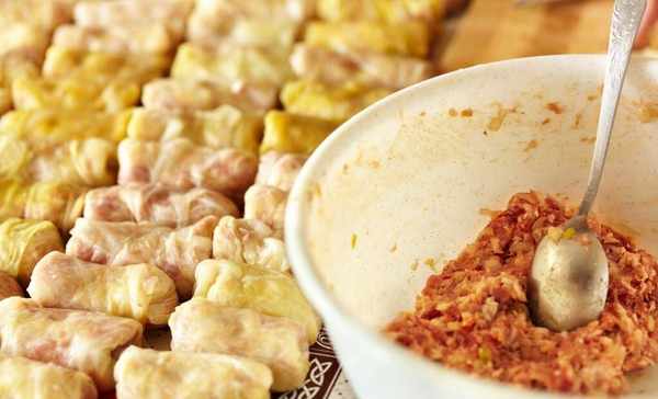 接下來鋪上一層白菜葉,放上肉餡,像包包袱那樣把白菜卷起來做成釀肉白菜餃子。葉子小瞭也不要緊,兩三片葉子搭起來,去找根韭菜或者是芹菜捆住就好,一點兒都不浪費材料。