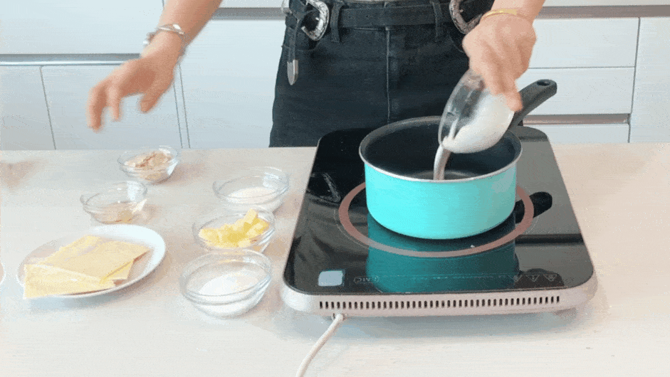 「2」將淡奶油、牛奶、黃油、細糖加入奶鍋,小火加熱,攪拌至完全融化。